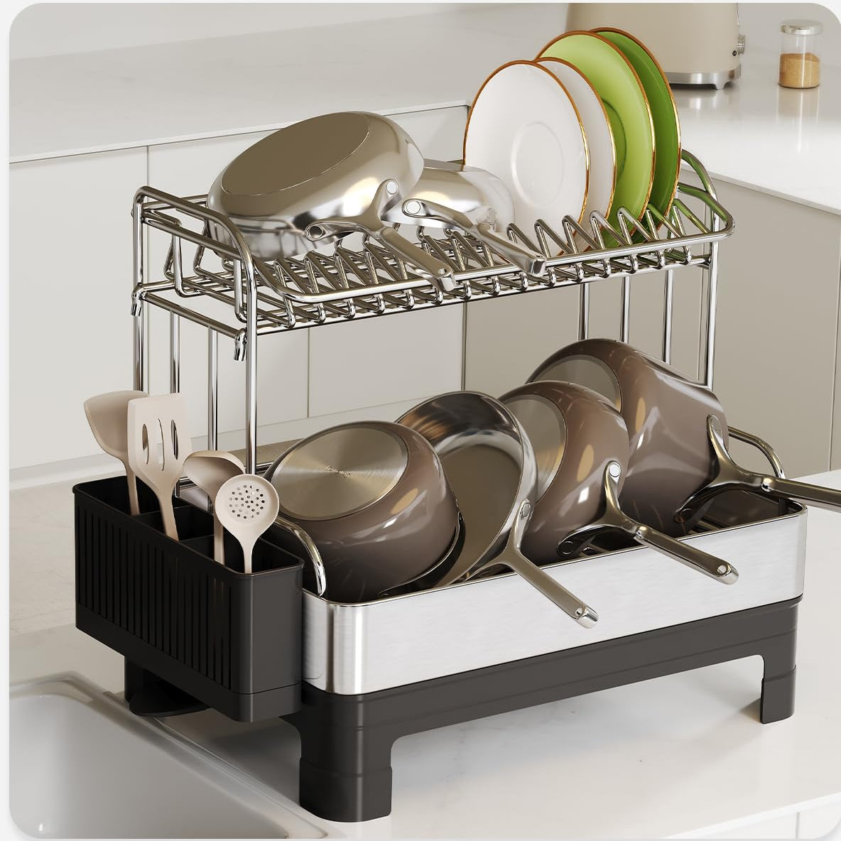 Hand-washing pots and pans is part of life in most kitchens — even ones with a dishwasher. This rack gives heavy cookware a proper place to drain: two tiers, a channeled drainboard, and stainless steel that holds up over time.